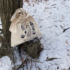 大きめのプロジェクトバッグです。イラストは「靴下」。生地は薄手で、ウェアや巻物など大きめの作品を入れるのに適しています。雑誌も入ります!