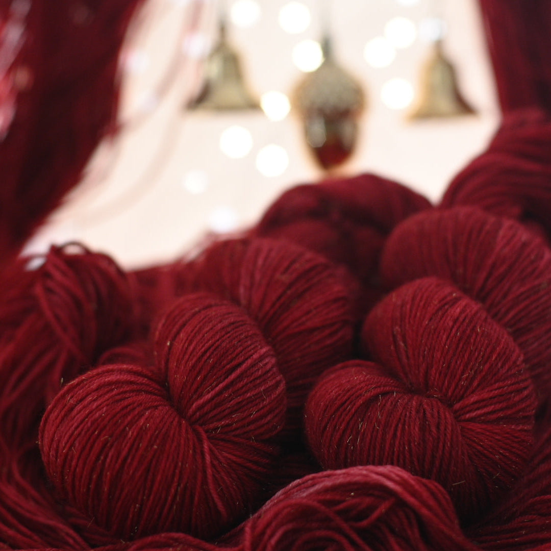 ゴールドのラメを鏤めたゴージャスな糸です。『Kommet, ihr Hirten(来たり、聞け)』はドイツで人気のある伝統的なクリスマスの歌。カラーもスタンダードなクリスマス色の濃赤に、少し濃淡を入れてみました。