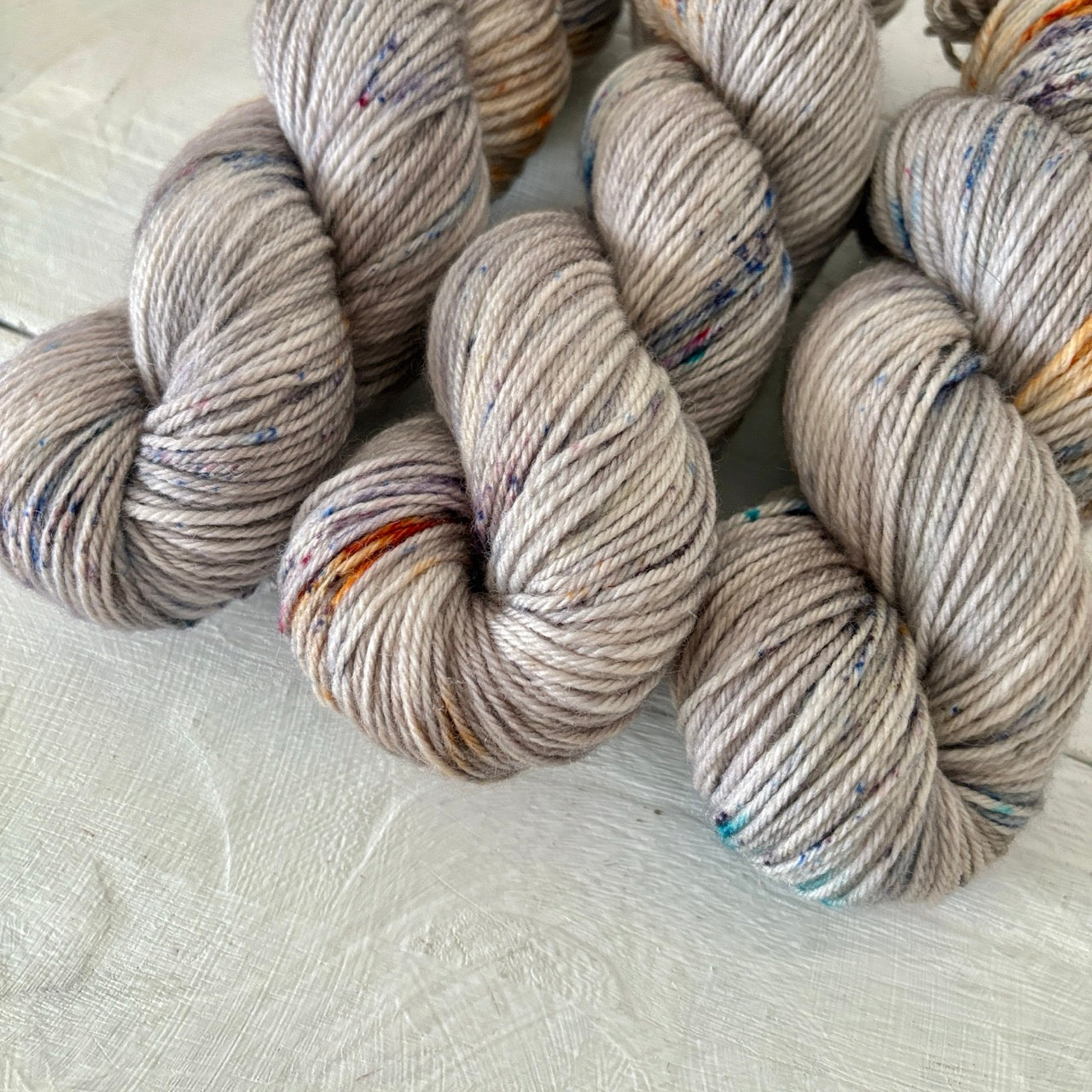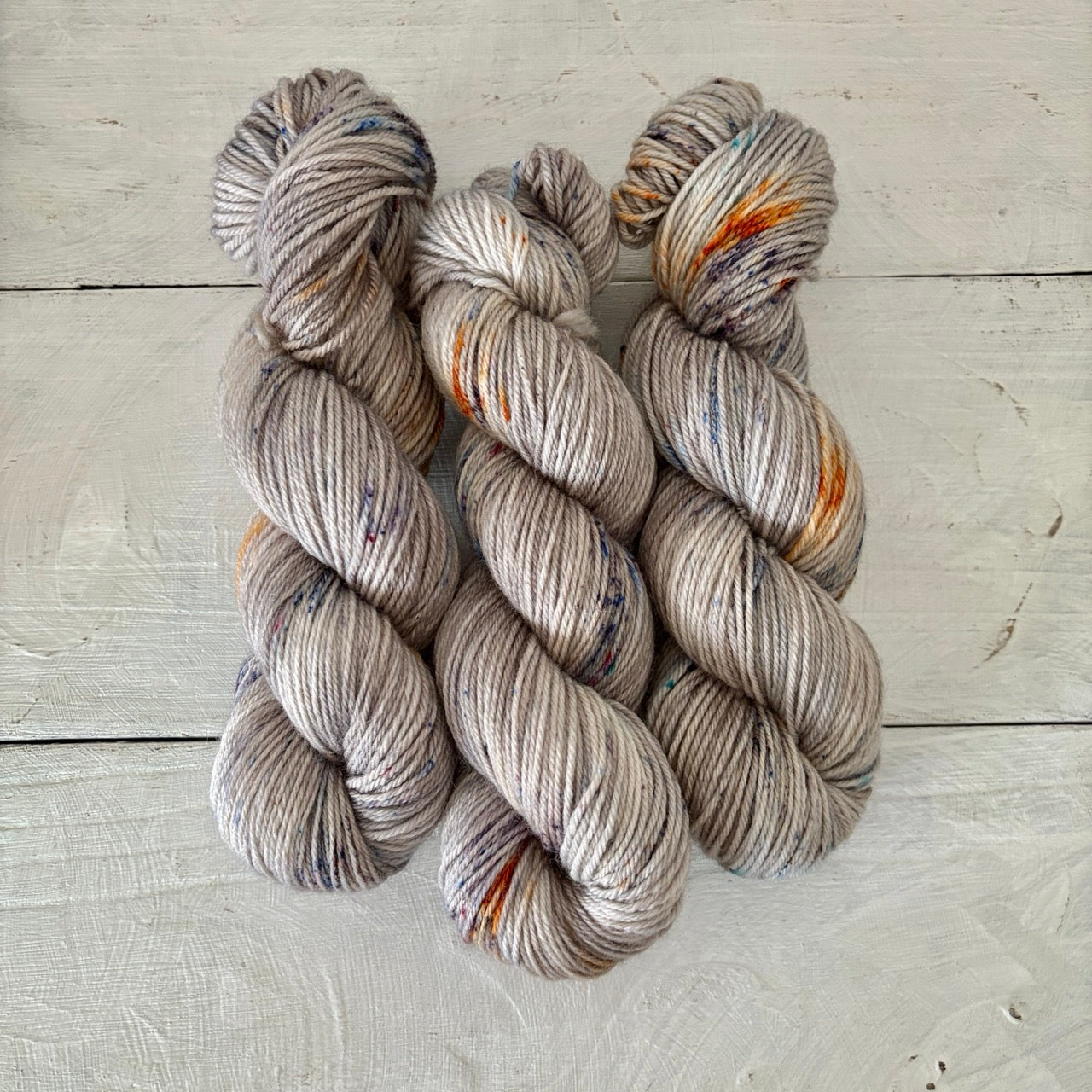手染めの1点ものになります。こちらはベーシックなソックヤーンと同じ組成で、太さはDKウェイト(合太程度)になります。