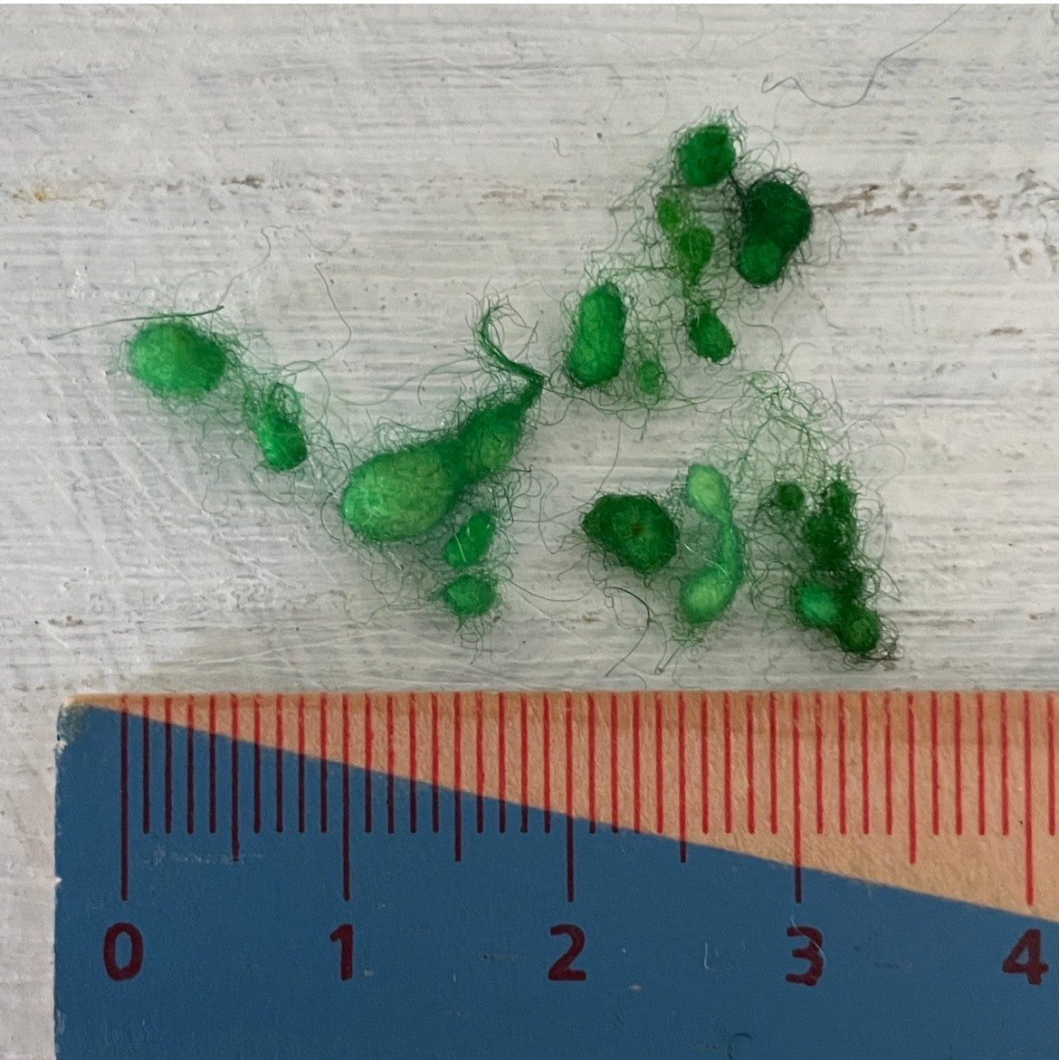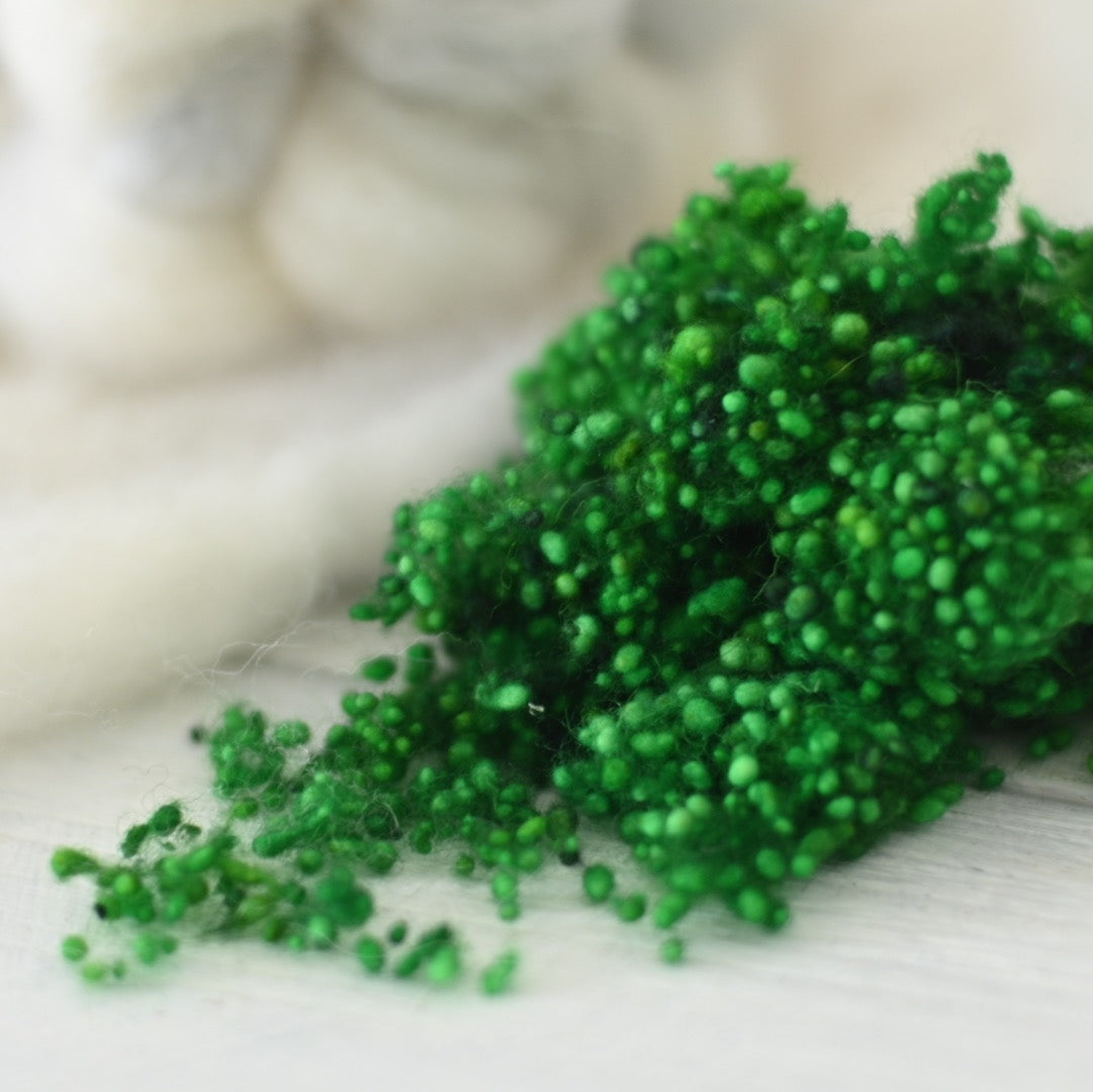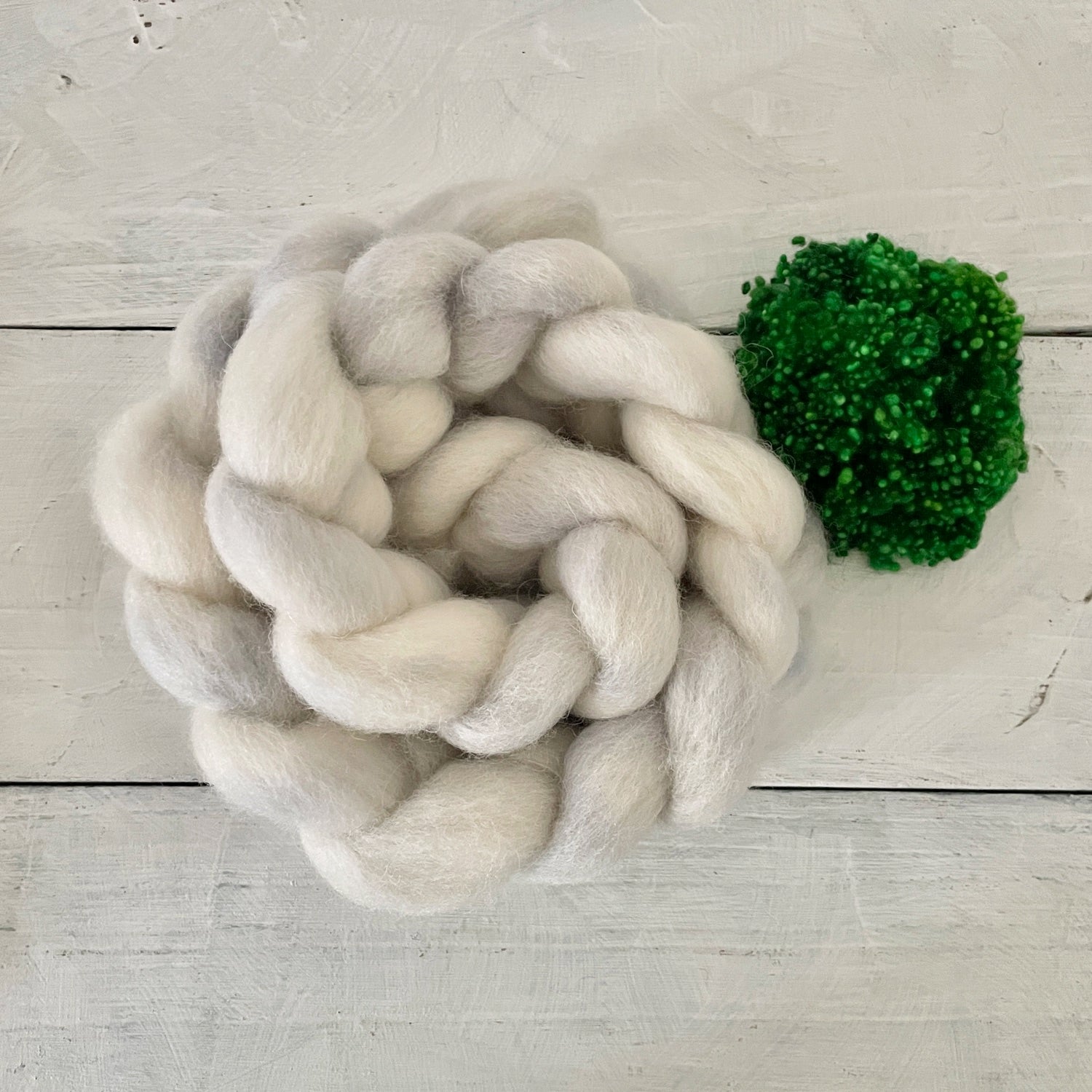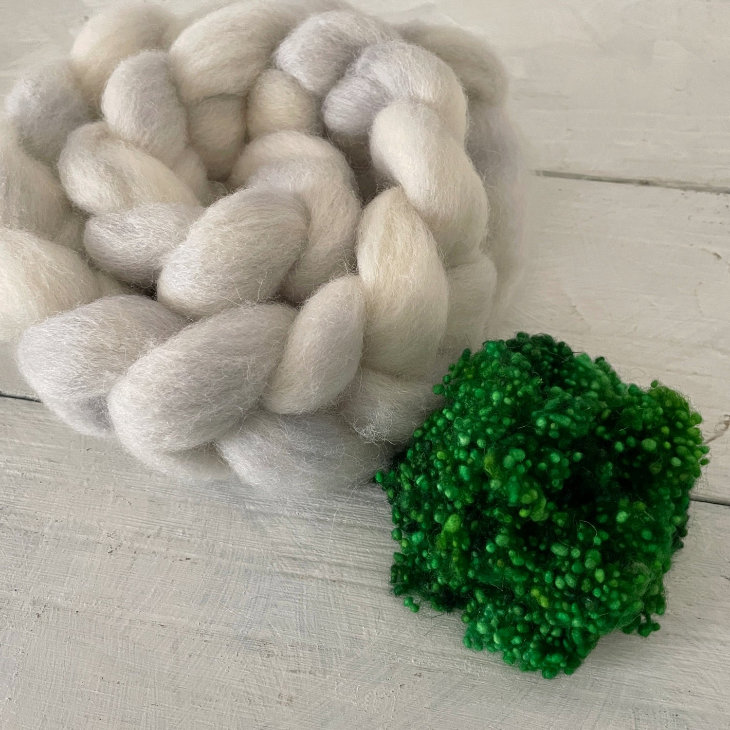 銀を思わせる淡いグレーに、グリーンのネップが付属します。ネップの量は約10gです。