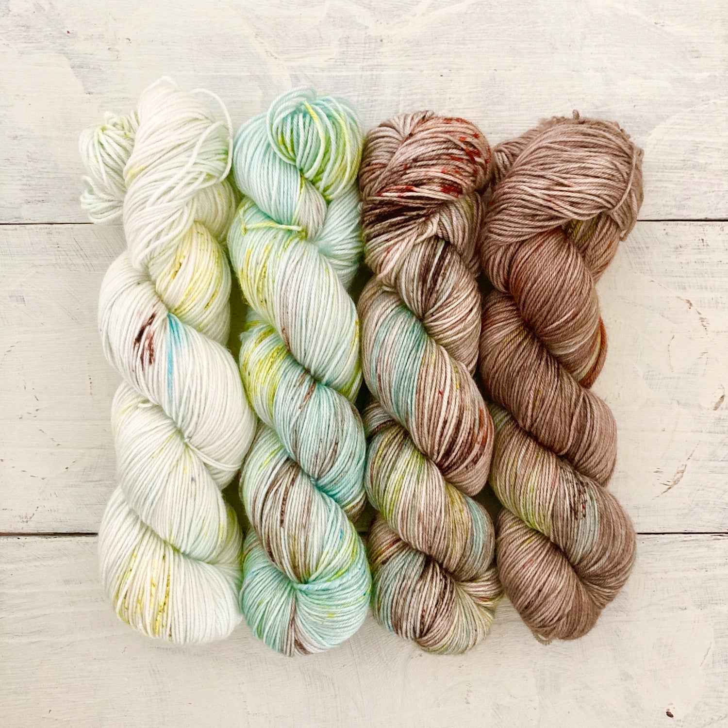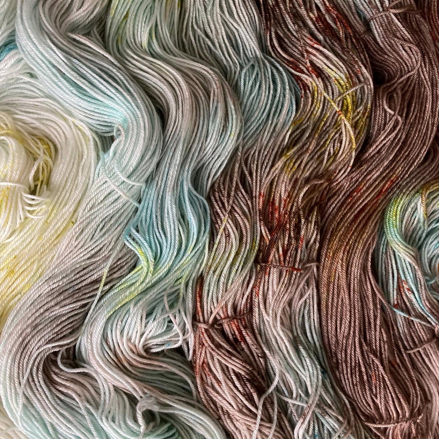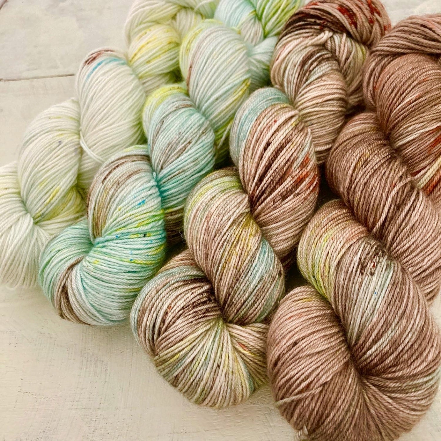 高級感のあるメリノシルクを、茶色からミントグリーンのフェードに染めたセットです。