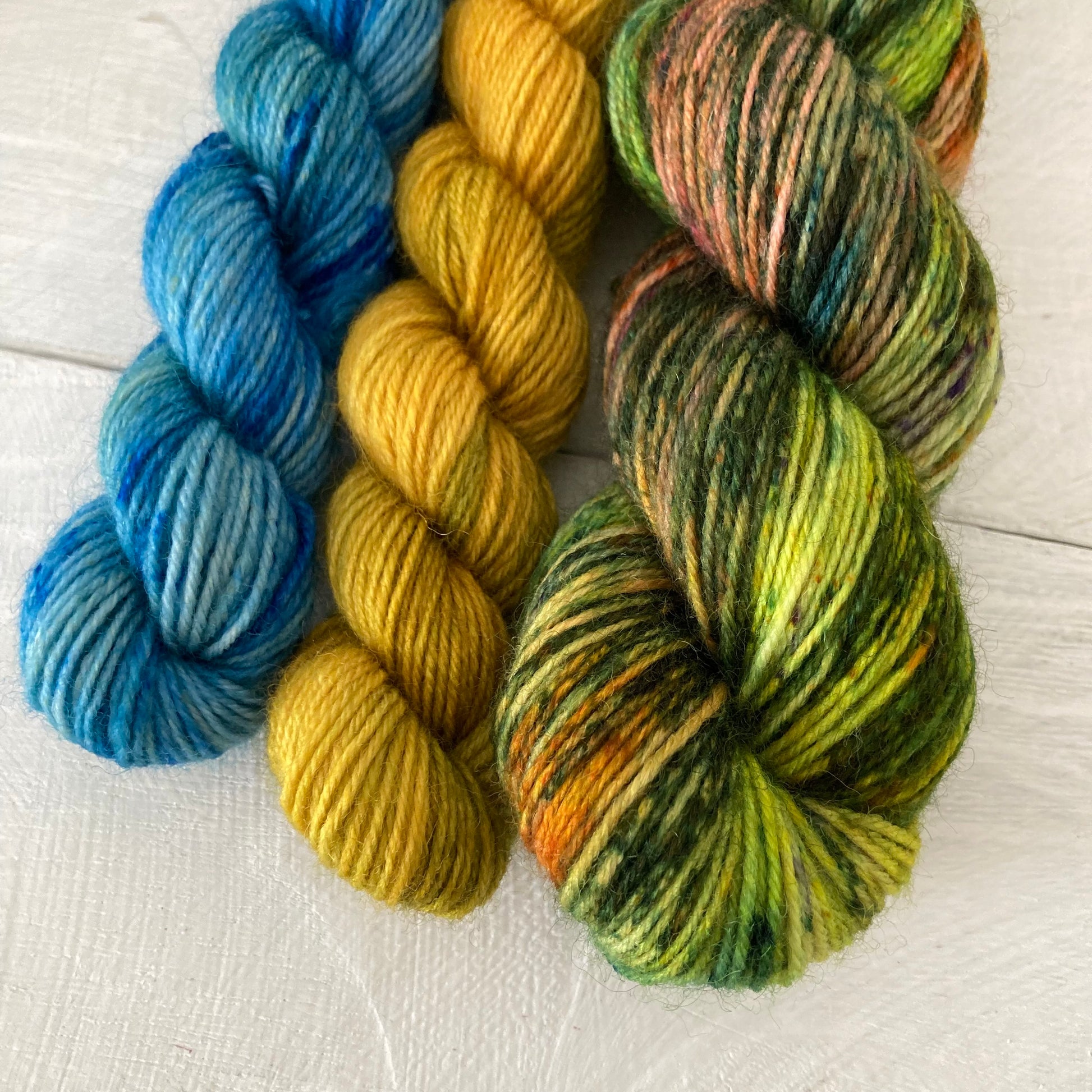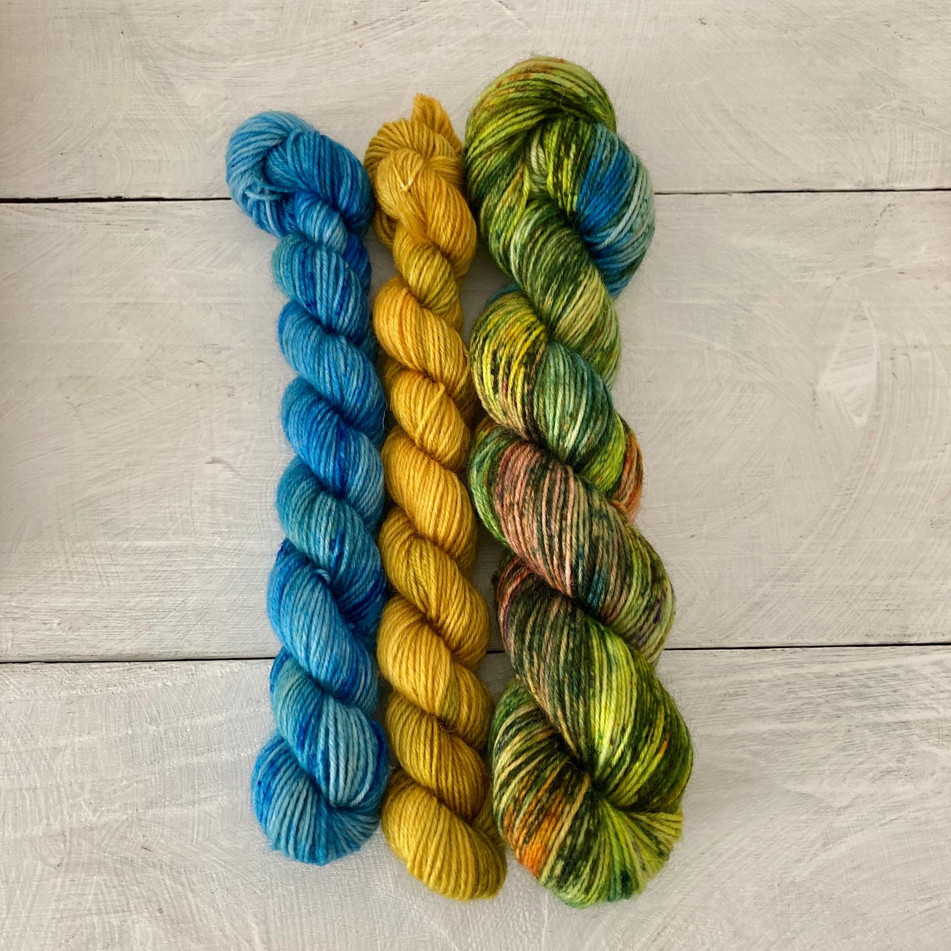 靴下1足分のメイン糸+つま先やかかと、ストライプや編み込みなど自由にお使いいただける組み合わせです。