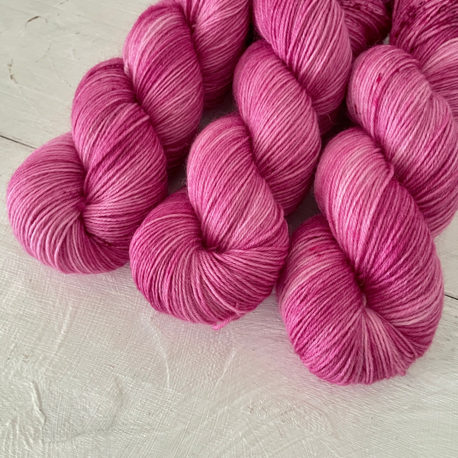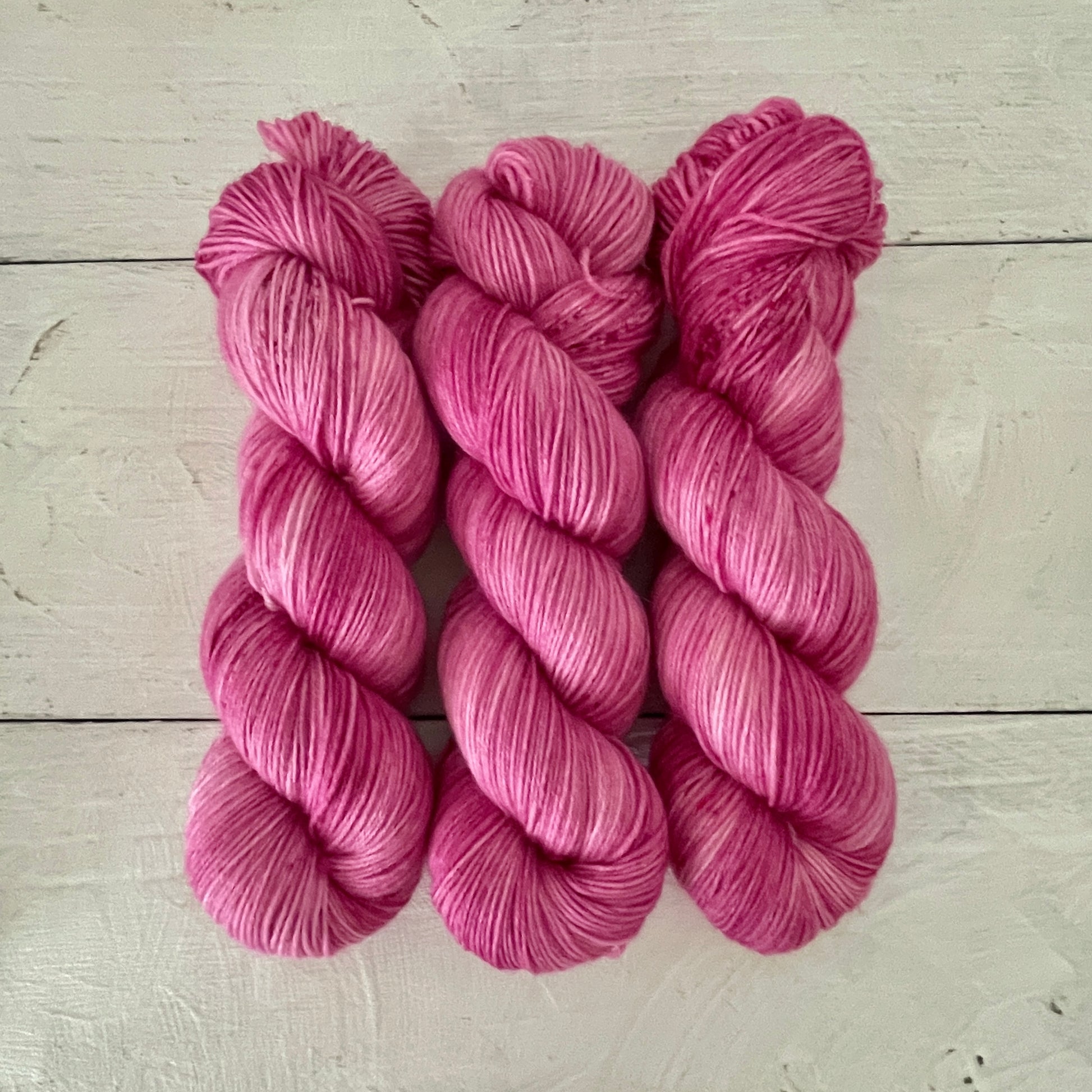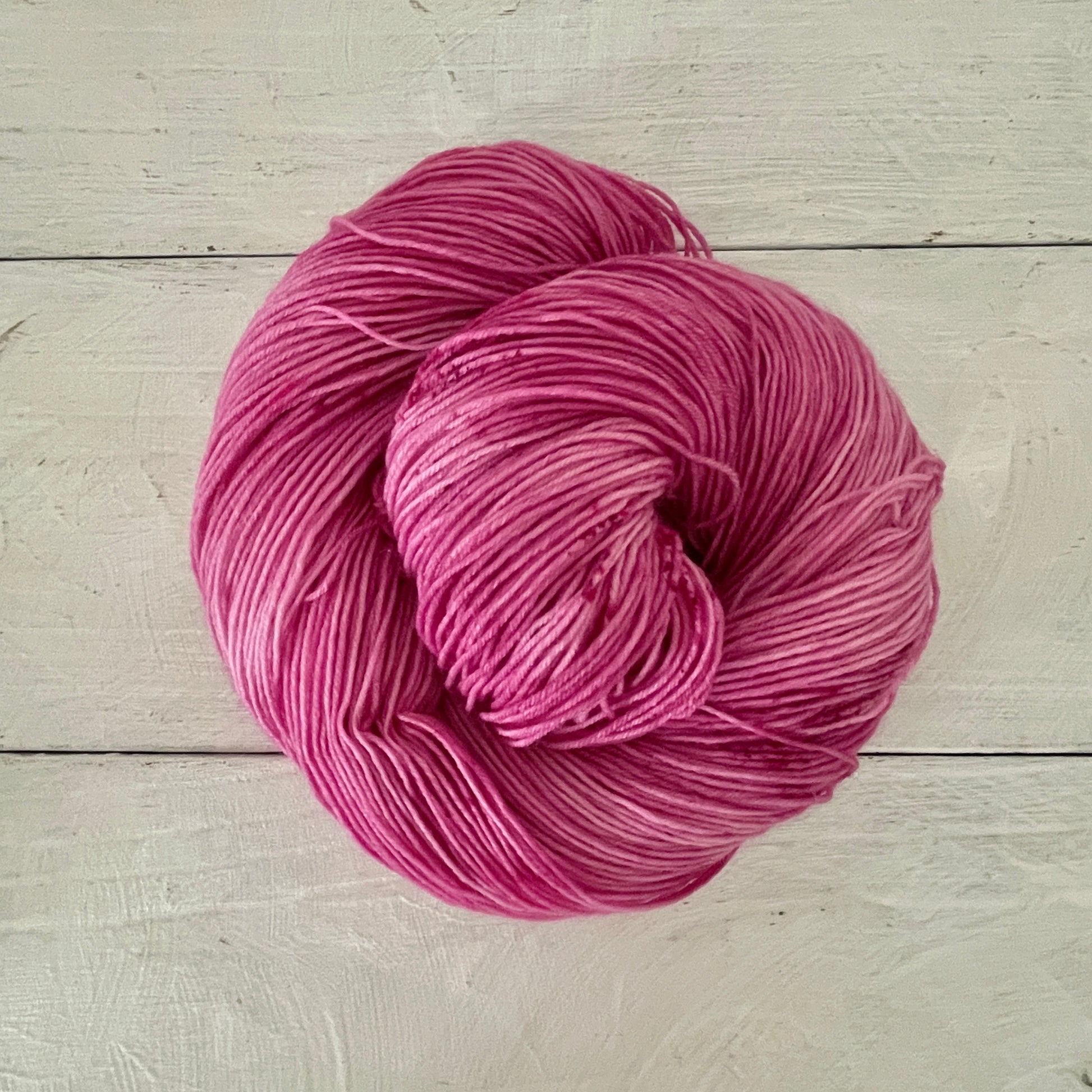 手染めの1点ものになります。BFLレースでリリースしたカラーのソックヤーン版となり、ベース色の違いから青みのある赤紫になっています。