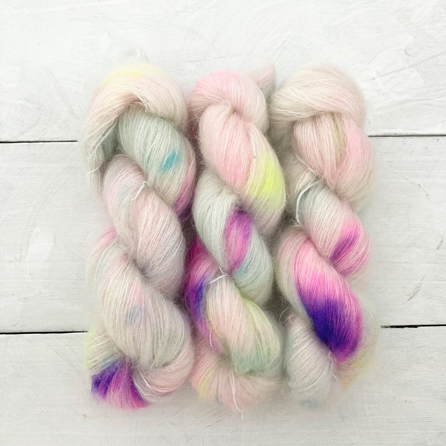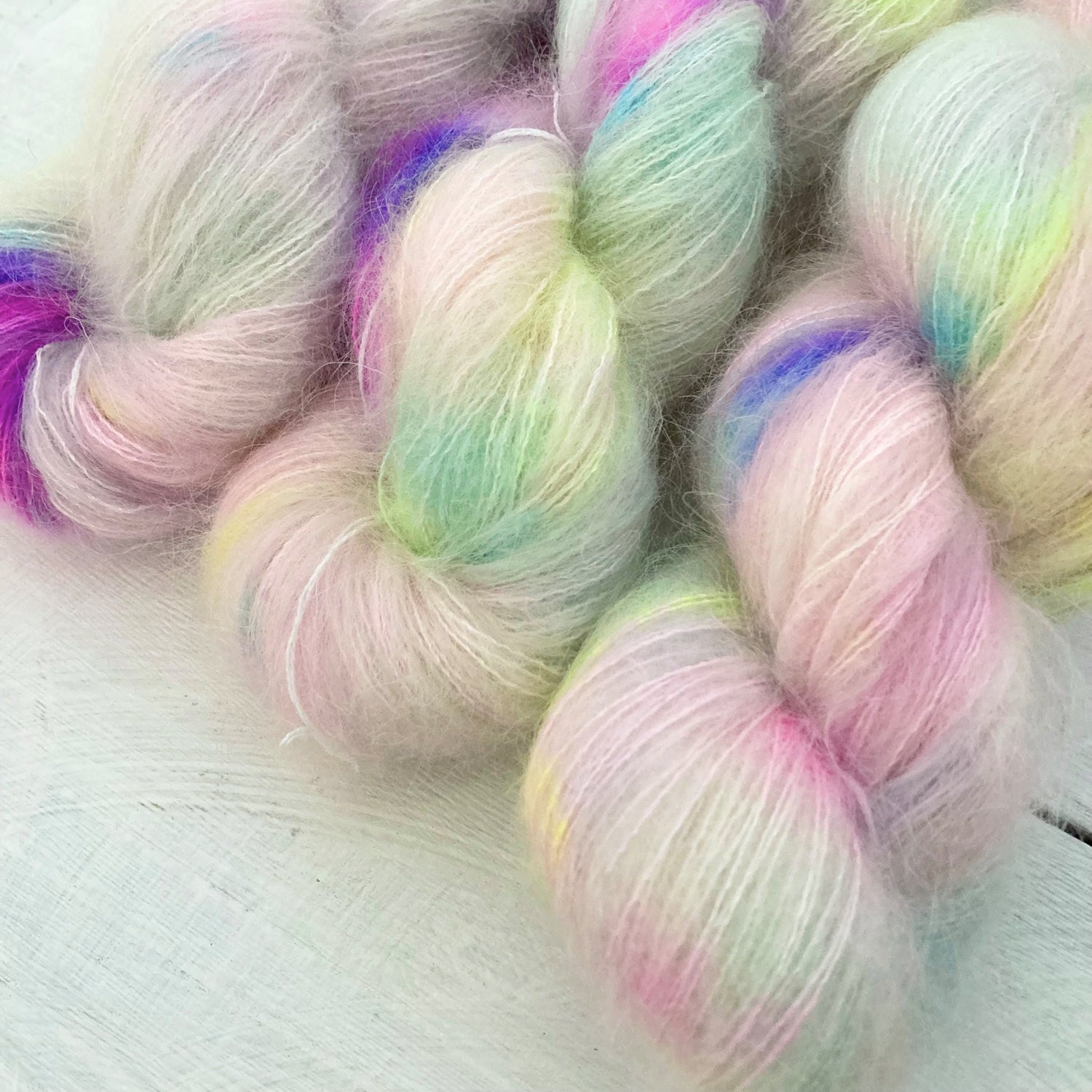 手染めの1点ものになります。ソックヤーンでリリースした色をモヘアで染めました。