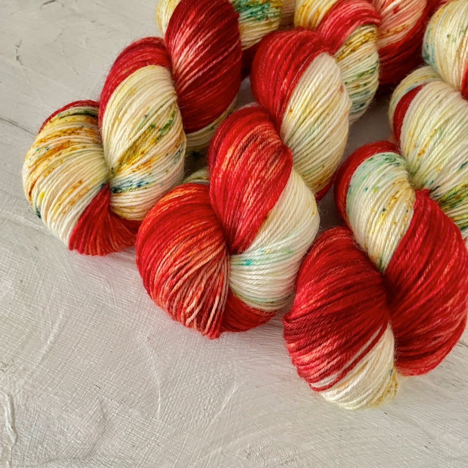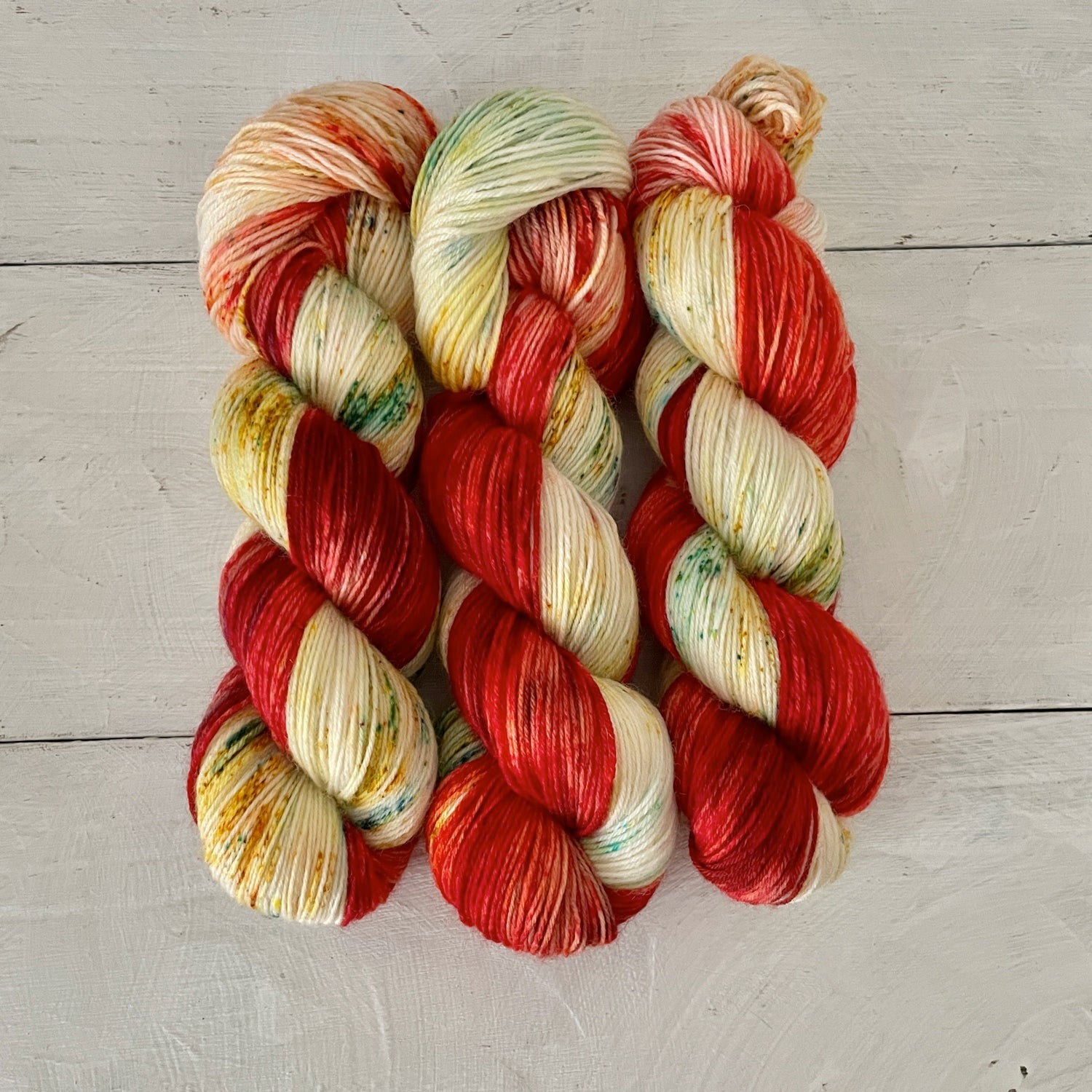 ドイツで「聖ニコラウスの日」(サンタクロースの原型となった聖人を祝う日)に唄われるわらべ歌をイメージしました。「Laßt uns froh und munter sein(楽しく陽気に)」という歌い出しの、子供らしい元気な歌です。プレゼントを待ちわびる子供たちの気持ちで染めてみました。靴下を編むとキャンディケーンのように縞々になります。