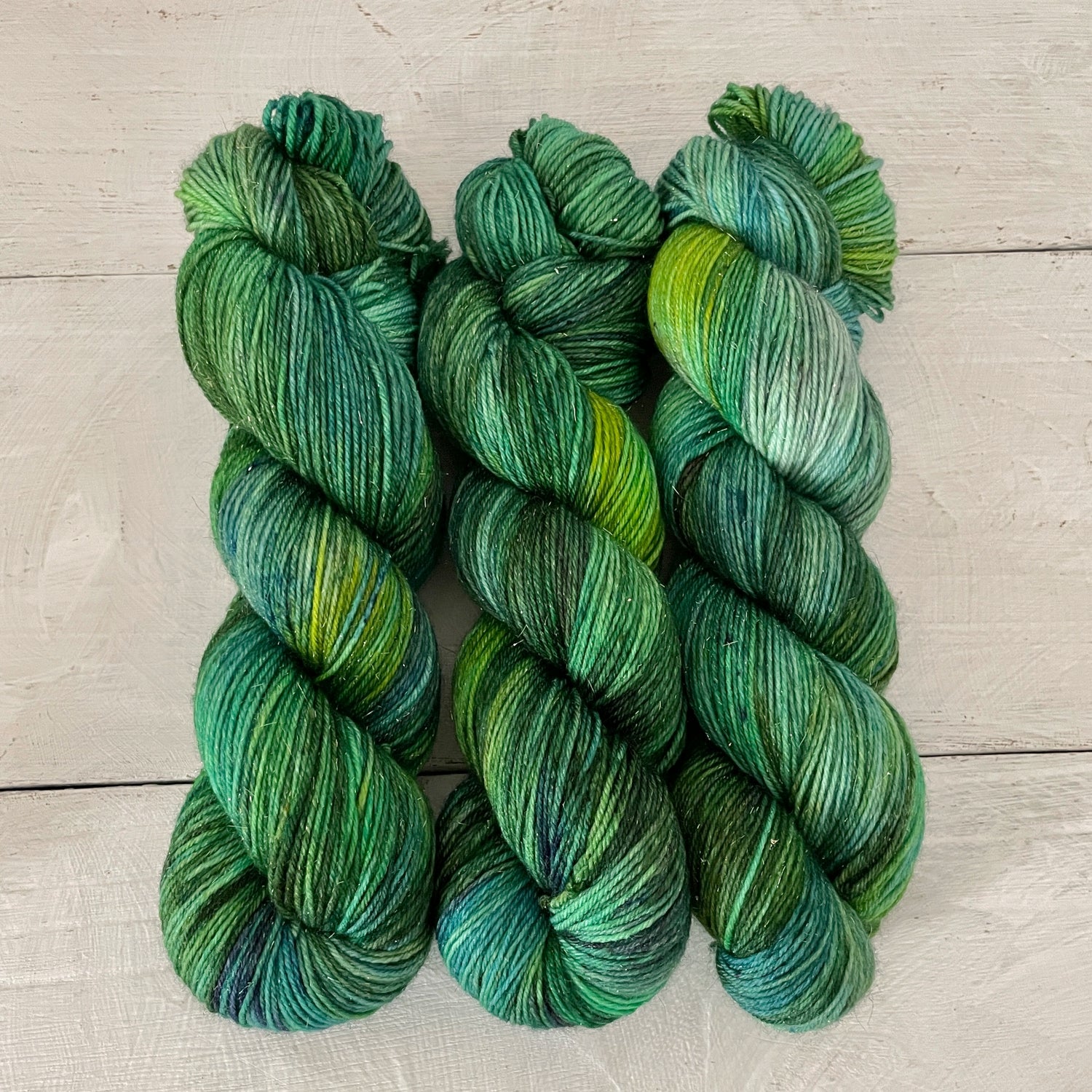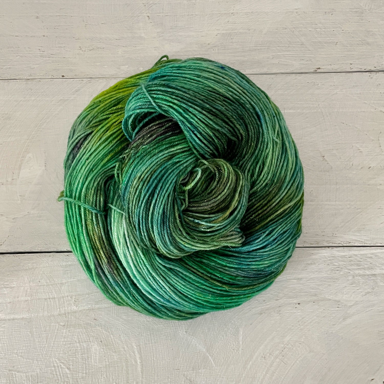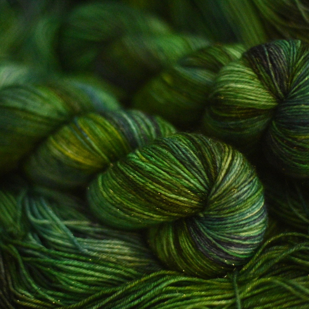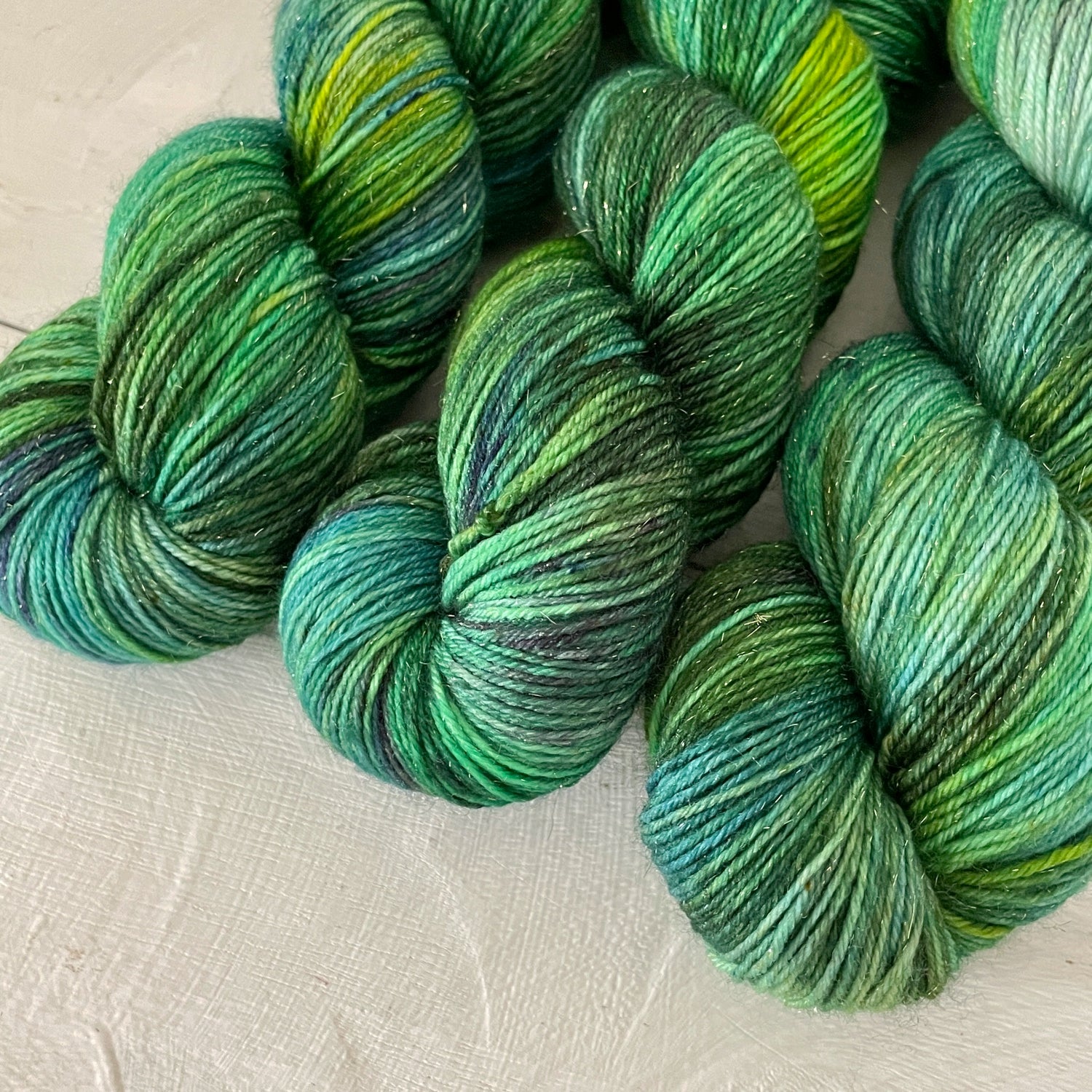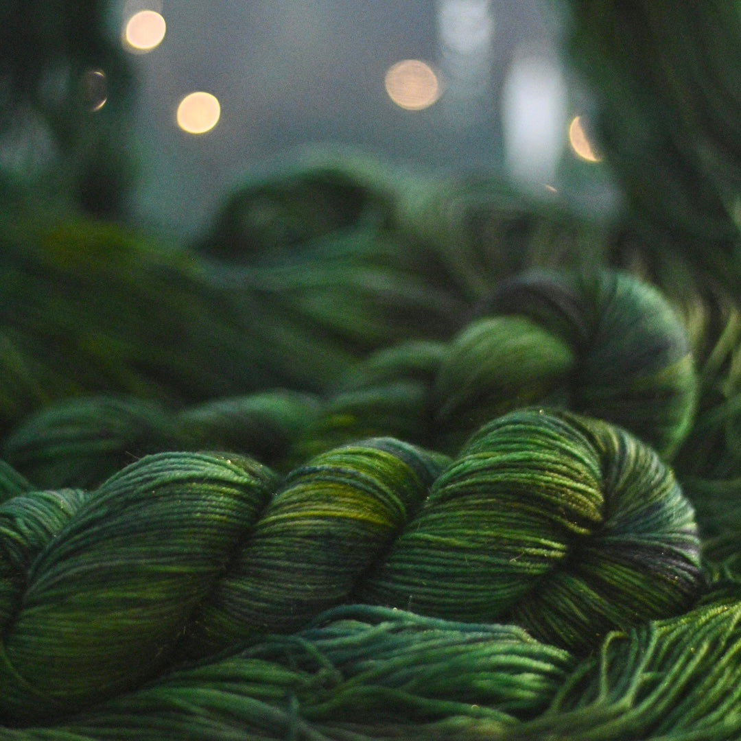 ゴールドのラメを鏤めたゴージャスな糸です。「Vierzehn Engel(14人の天使)」はクリスマスの出し物として親しまれているフンパーディンクのオペラ「ヘンゼルとグレーテル」から、眠りについた兄妹を守るように現れる天使たちのシーンです。森の中、天使たちがダンスをするとても美しいシーンを、深いグリーンで染めてみました。