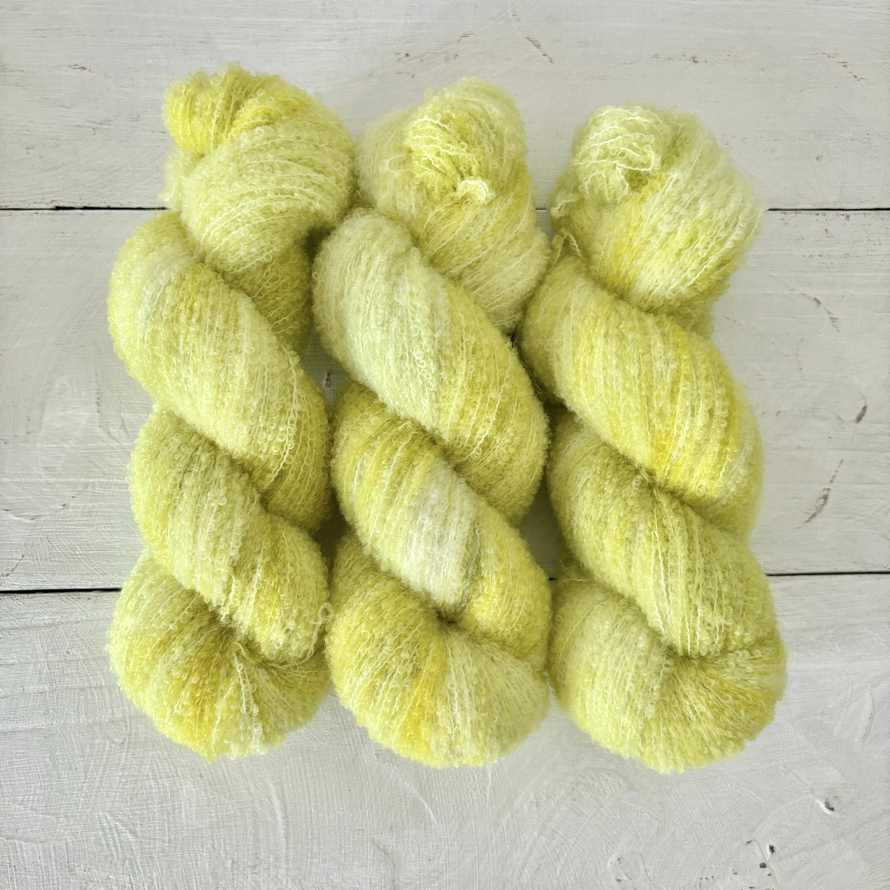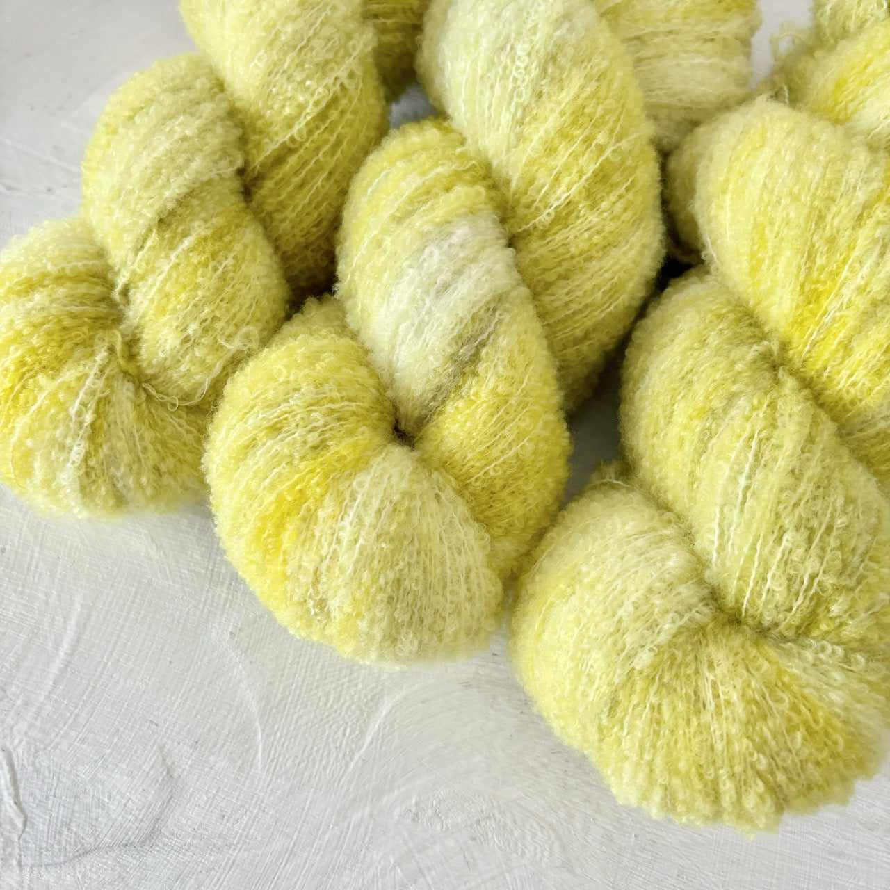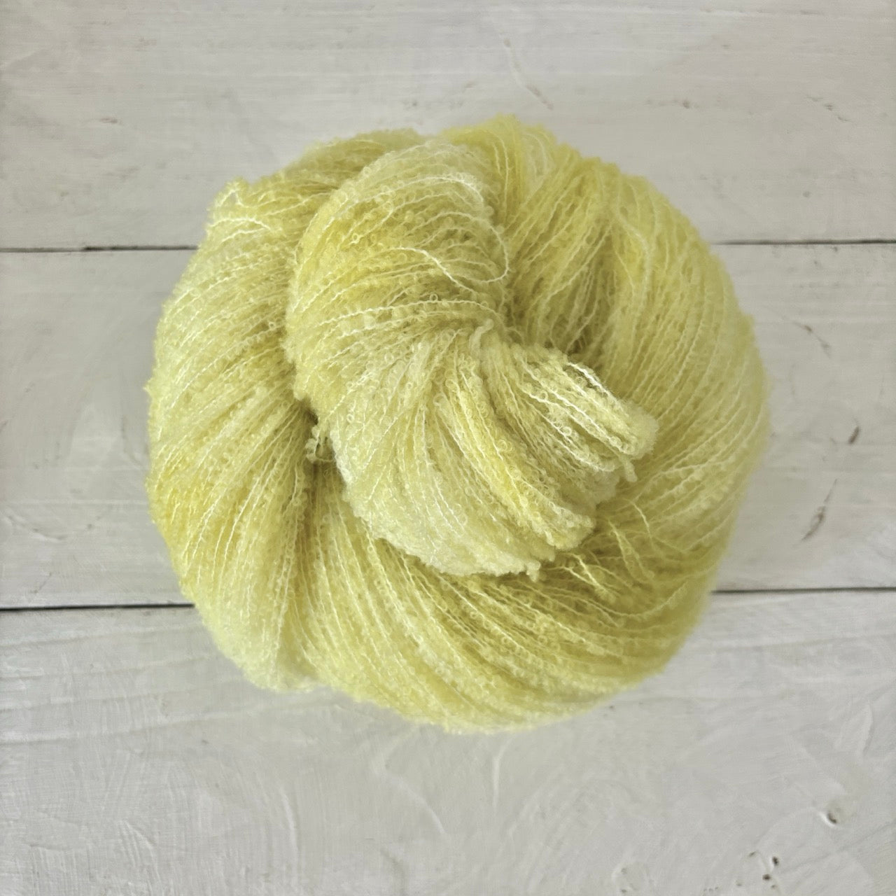 レースウェイトのナイロンに柔らかなオーストラリア産メリノウールを巻きつけたブークレ、ローゲージで編んでループを際立たせても、ストレートの糸と引き合わせて編み地に変化を持たせても。