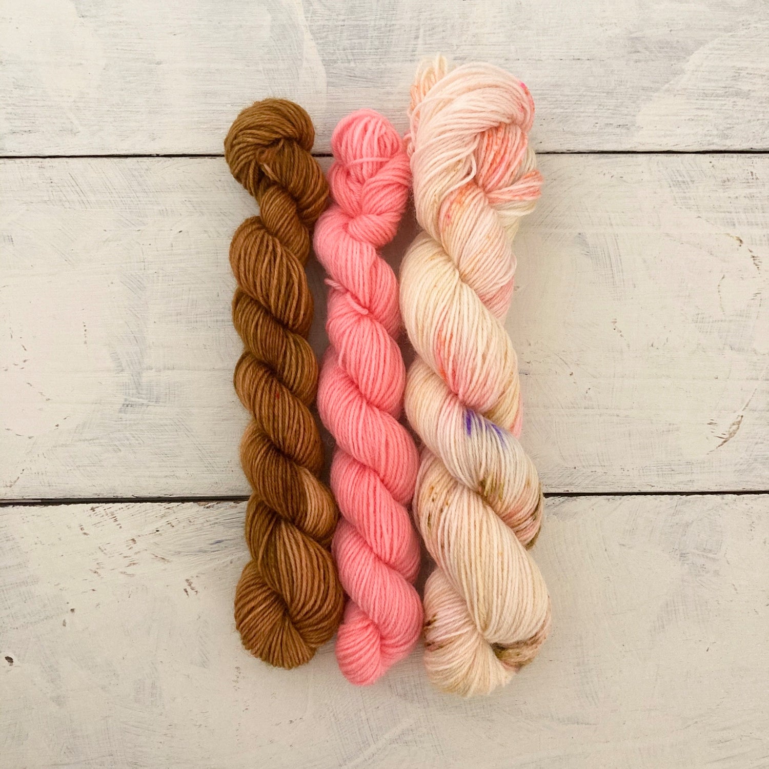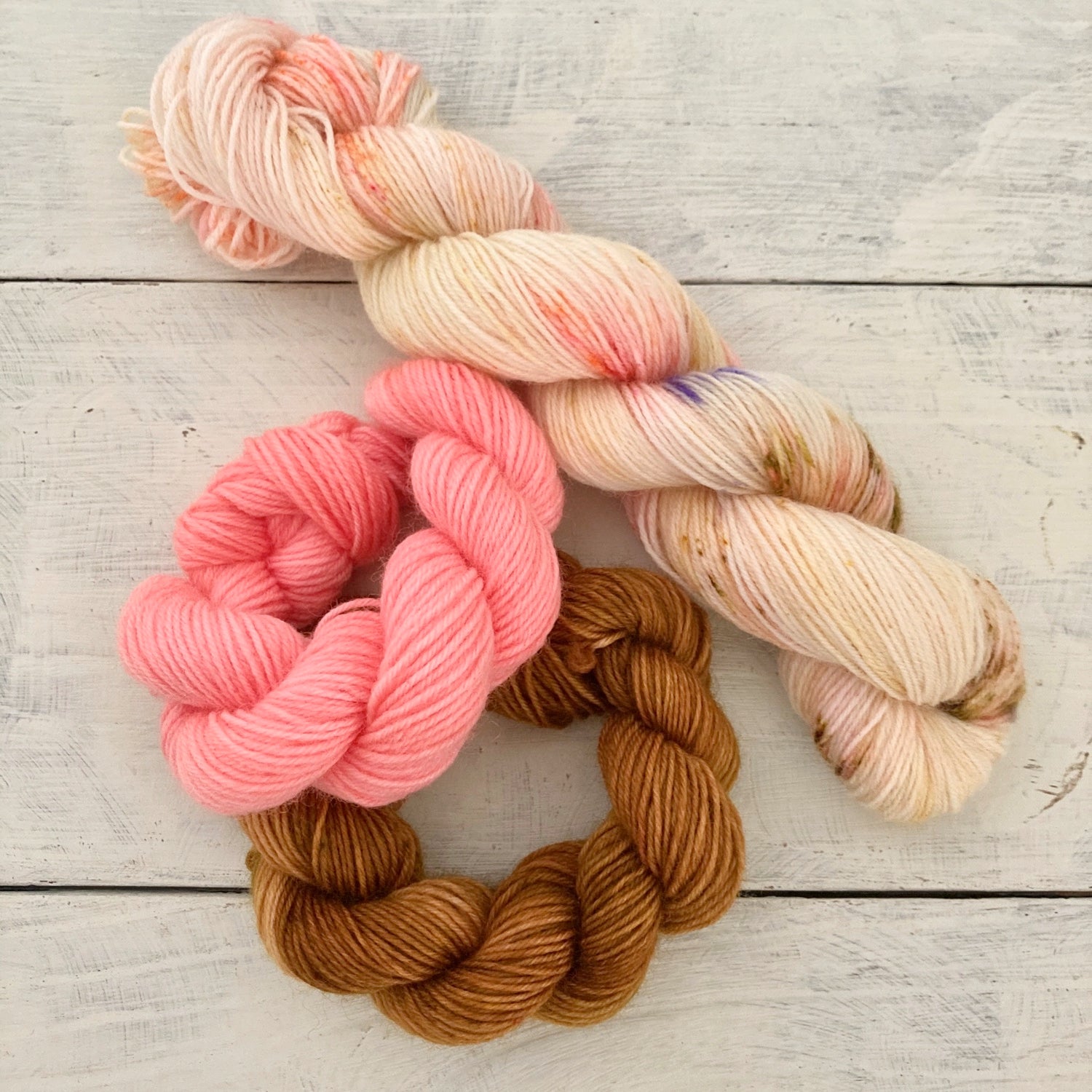 配色糸のミニかせはロココを思わせるコーラルピンク、ニュアンスのある茶色はルネサンスの教会に見立て、メインカラーはそれらを混じることなく配置してみました。