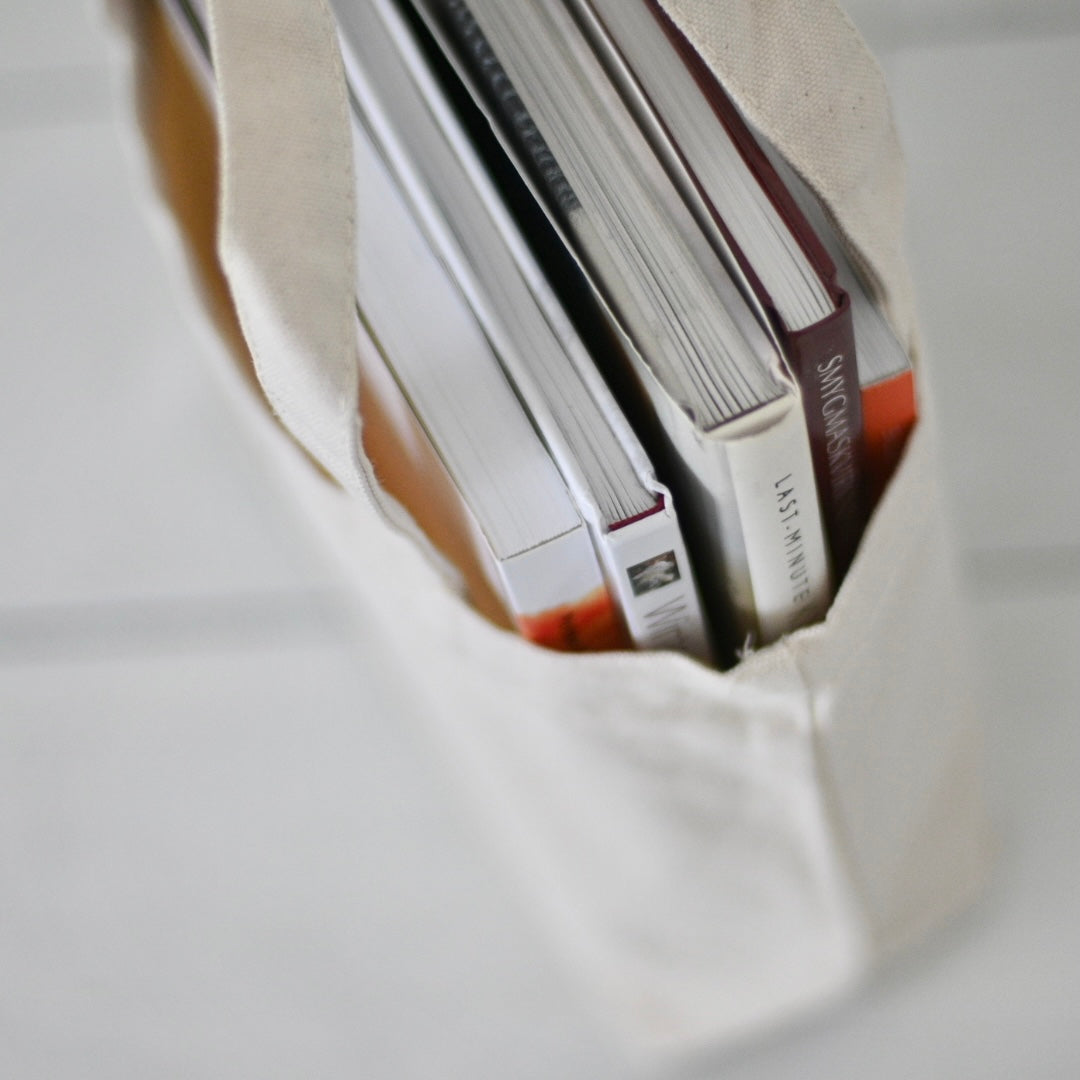 編みかけの作品を入れて、モバイル編みに室内での移動にちょうど良いサイズ。マチがたっぷりあり、しっかりした生地なので本やボトルを入れてもOKです。
